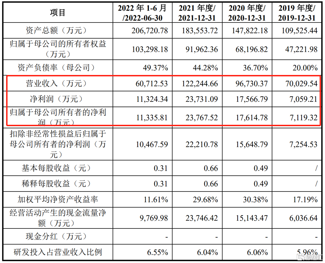 2019年至2022年1-6月报告期,公司的营业收入分别为7.0亿元、9.67亿元、12.22亿元和6.07亿元,对应的归母净利润分别为7119.32万元、1.76亿元、2.38亿元和1.13亿元。