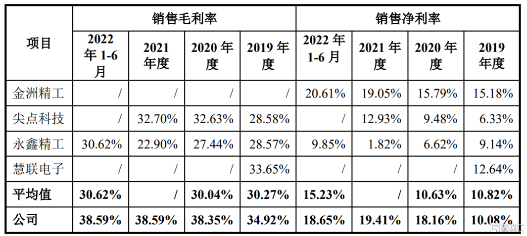报告期内,公司的销售毛利率分别为34.92%、38.35%、38.59%和38.59%,整体高于可比上市公司的平均水平。