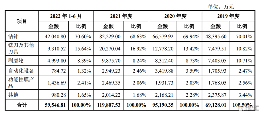 分产品来看,公司主要产品包括钻针、铣刀及其他刀具、刷磨轮等,其中钻针是公司的主要收入来源,其收入占比约70%。