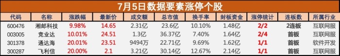 7月5日,数据要素概念延续强势,飞利信(300287)、通达海(301378)20CM涨停;湘邮科技(600476)2连板,竞业达(003005)涨停,三维天地(301159)、铜牛信息(300895)、零点有数(301169)等跟涨。