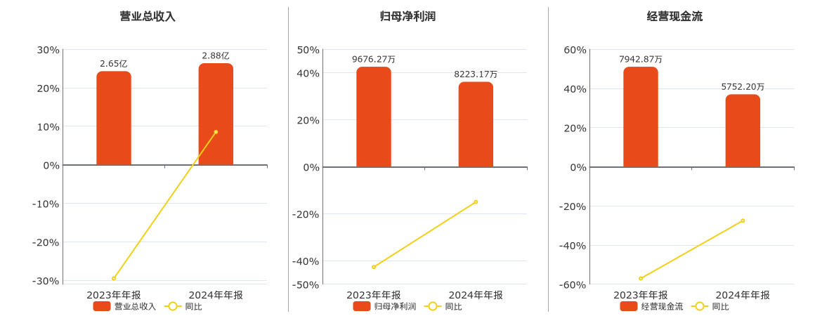公司营业总收入为2.88亿元。归母净利润为8223.17万元,较去年同报告期归母净利润减少1453.10万元,同比较去年同期下降15.02%。经营活动现金净流入为5752.20万元,较去年同报告期经营活动现金净流入减少2190.68万元,同比较去年同期下降27.58%。