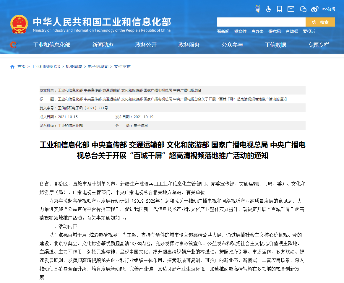 2021年10月,工业和信息化部、中央宣传部、交通运输部、文化和旅游部、国家广播电视总局、中央广播电视总台等六部门联合推出了为期两年的“百城千屏”超高清视频落地推广活动,给LED显示行业以及超高清视频产业带来了极大的发展机遇。
