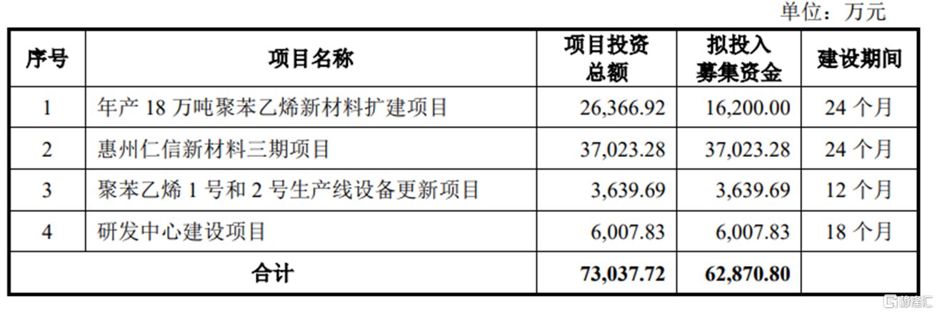 本次IPO拟募集的资金主要用于年产18万吨聚苯乙烯新材料扩建项目、惠州仁信新材料三期项目、聚苯乙烯1号和2号生产线设备更新项目等。