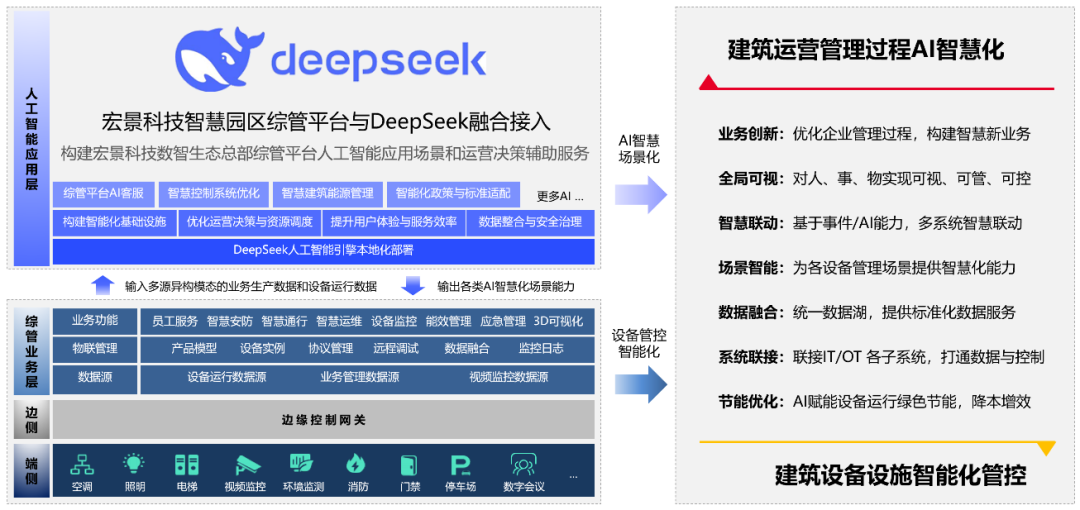 DeepSeek作为国产AI大模型的代表,其技术优势显著。此次技术接入融合到宏景科技数智生态总部智慧园区综管平台,主要得益于其高效计算、多模态融合的能力,以及低成本、架构开源且支持可私有化部署的特性。通过DeepSeek大模型构建智能化编程、预测性维护和动态优化等能力,将重构智能化设备控制体系的数字化架构,为大厦的智慧化管理提供强大支撑。