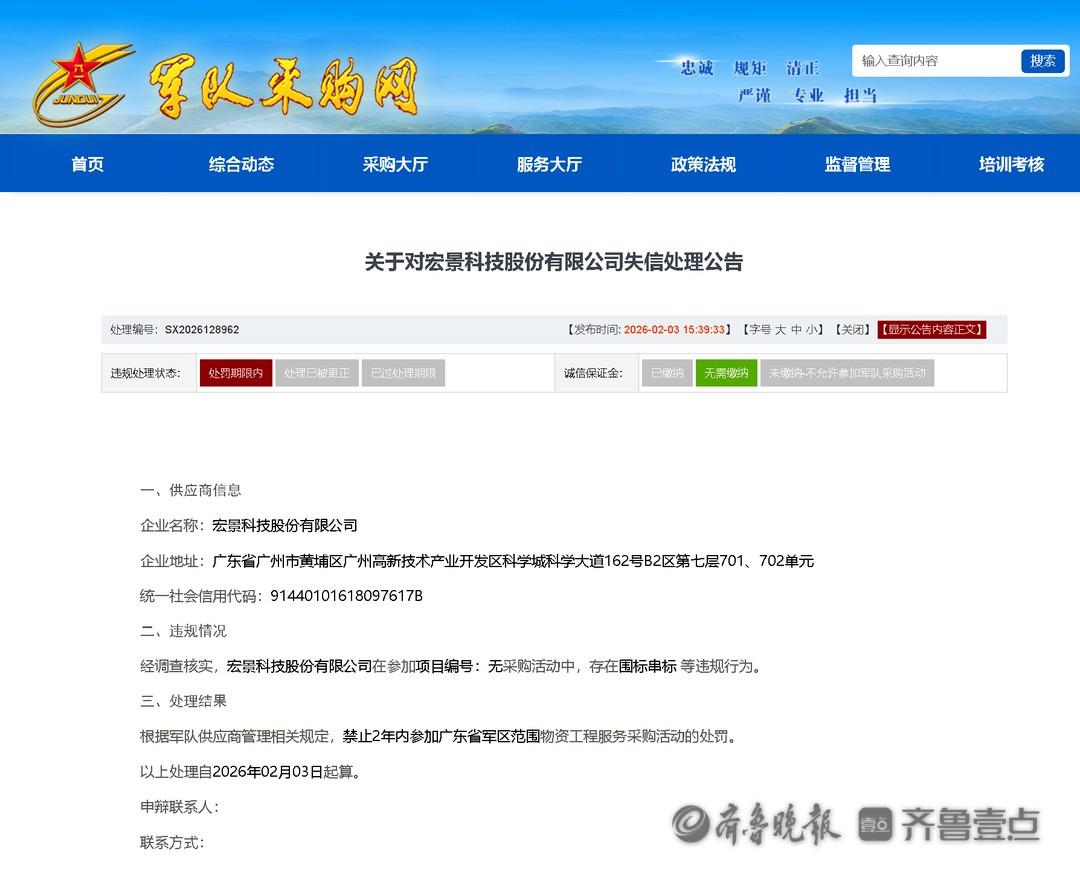 近日,军队采购网发布关于对宏景科技股份有限公司失信处理公告。