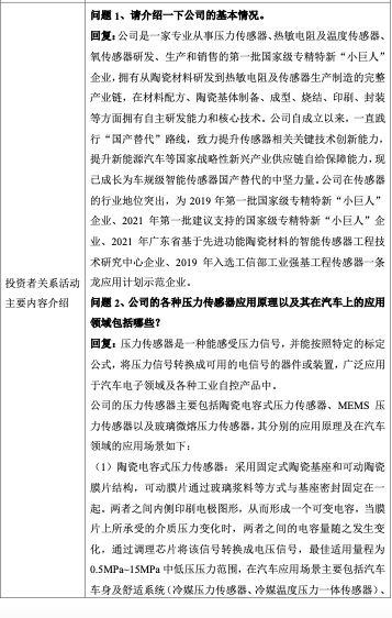 安培龙向投资者介绍了公司的基本情况。公司是一家专业从事压力传感器、热敏电阻及温度传感器、氧传感器研发、生产和销售的第一批国家级专精特新“小巨人”企业,拥有从陶瓷材料研发到热敏电阻及传感器生产制造的完整产业链,在材料配方、陶瓷基体制备、成型、烧结、印刷、封装等方面拥有自主研发能力和核心技术。公司自成立以来,一直践行“国产替代”路线,致力提升传感器相关关键技术创新能力,提升新能源汽车等国家战略性新兴产业供应链自给保障能力,现已成长为车规级智能传感器国产替代的中坚力量。公司在传感器的行业地位突出,为2019年第一批国家级专精特新“小巨人”企业、2021年第一批建议支持的国家级专精特新“小巨人”企业、2021年广东省基于先进功能陶瓷材料的智能传感器工程技术研究中心企业、2019年入选工信部工业强基工程传感器一条龙应用计划示范企业。