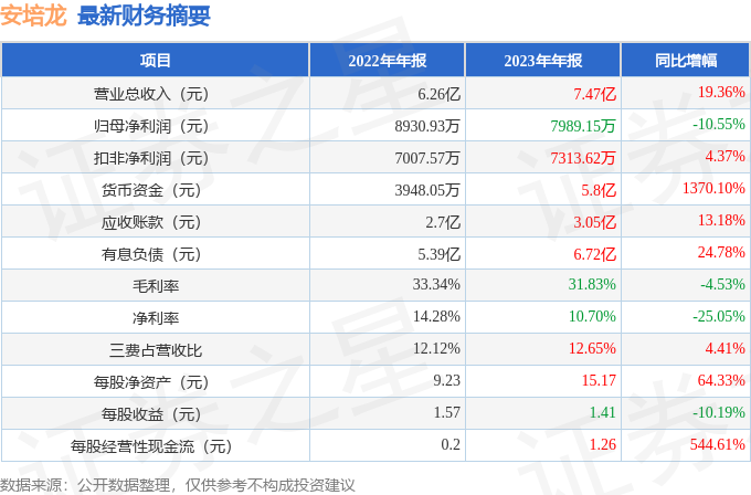 近期安培龙(301413)发布2023年年报。根据财报显示,本报告期中安培龙增收不增利,应收账款上升。截至本报告期末,公司营业总收入7.47亿元,同比上升19.36%,归母净利润7989.15万元,同比下降10.55%。按单季度数据看,第四季度营业总收入1.99亿元,同比上升20.2%,第四季度归母净利润1893.74万元,同比下降21.3%。