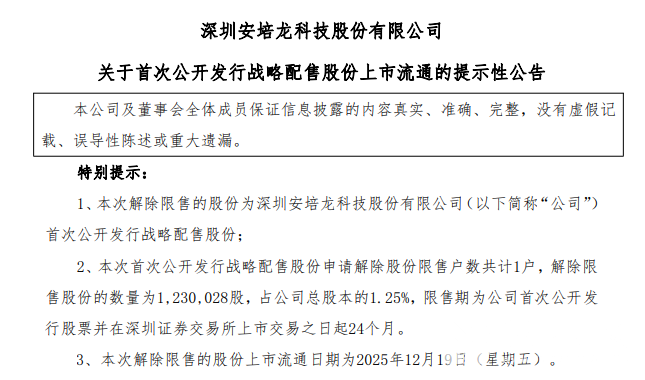 12月16日晚间, 安培龙 (SZ 301413)发布公告称,公司限售股份约123万股将于2025年12月19日解禁并上市流通,占公司总股本比例为1.25%。