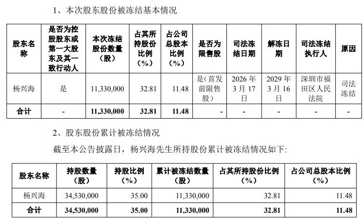 世纪恒通公告显示,杨兴海本次冻结股份数量11,330,000股,占其所持股份比例32.81%,占公司总股本比例11.48%。