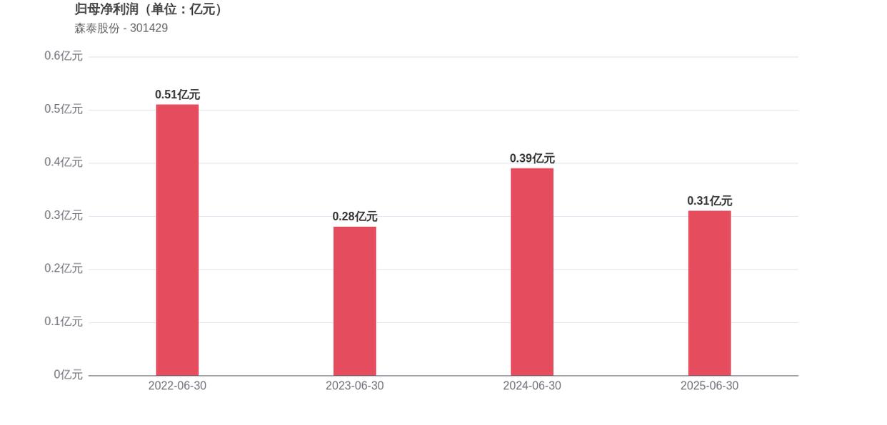 在2025年上半年,森泰股份的经营业绩呈现收入增长但盈利下滑的态势,实现营业收入5.03亿元,同比增长20.96%,但归母净利润0.31亿元,同比下滑19.97%。引人关注的是,公司二季度归母净利润环比下降29.35%,显示出盈利能力的波动性。