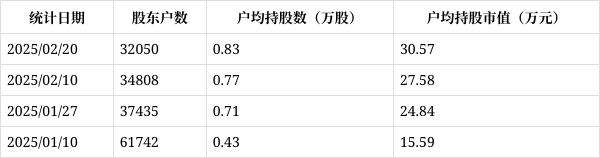 从2月24日公开信息显示,钧崴电子截至2025年2月20日公司股东户数为3.21万户,较上期(2025年2月10日)减少2758户,降幅为7.92%,持股趋于集中。