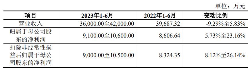 经初步测算,预计公司2023年1-6月实现营业收入36,000.00万元至42,000.00万元,变动比例-9.29%至5.83%;归属于母公司股东的净利润9,100.00万元至10,600.00万元,变动比例5.73%至23.16%;扣除非经常性损益后归属于母公司股东的净利润9,000.00万元至10,500.00万元,变动比例8.12%至26.14%。