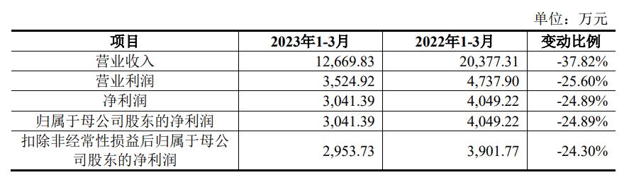 2023年1-3月,公司营业收入为12,669.83万元,同比下降37.82%;归属于母公司股东的净利润为3,041.39万元,同比下降24.89;扣除非经常性损益后归属于母公司股东的净利润为2,953.73万元,同比下降24.30%;经营活动产生的现金流量净额为1,898.31万元,同比增长772.75%。