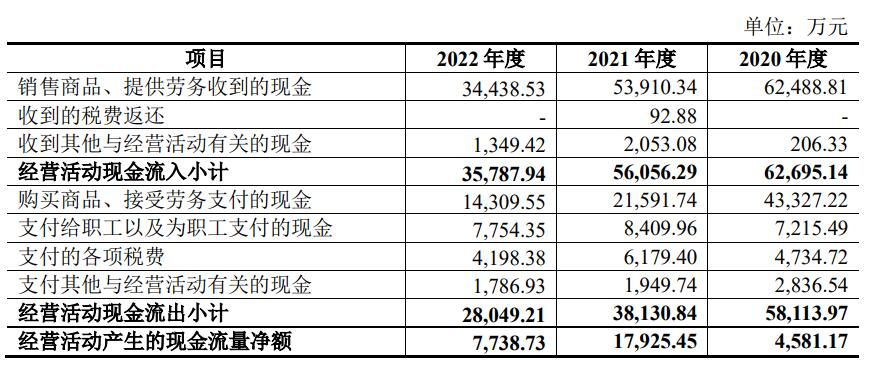2020年、2021年、2022年,博盈特焊销售商品、提供劳务收到的现金分别为62,488.81万元、53,910.34万元、34,438.53万元,经营活动产生的现金流量净额分别为4,581.17万元、17,925.45万元、7,738.73万元。
