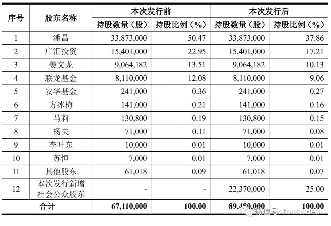 IPO后,潘昌持股为37.86%,广汇投资持股为17.21%,姜文龙持股为10.13%,联龙基金持股为9.06%,安华基金持股为0.27%,方冰梅持股为0.16%,马莉持股为0.15%。