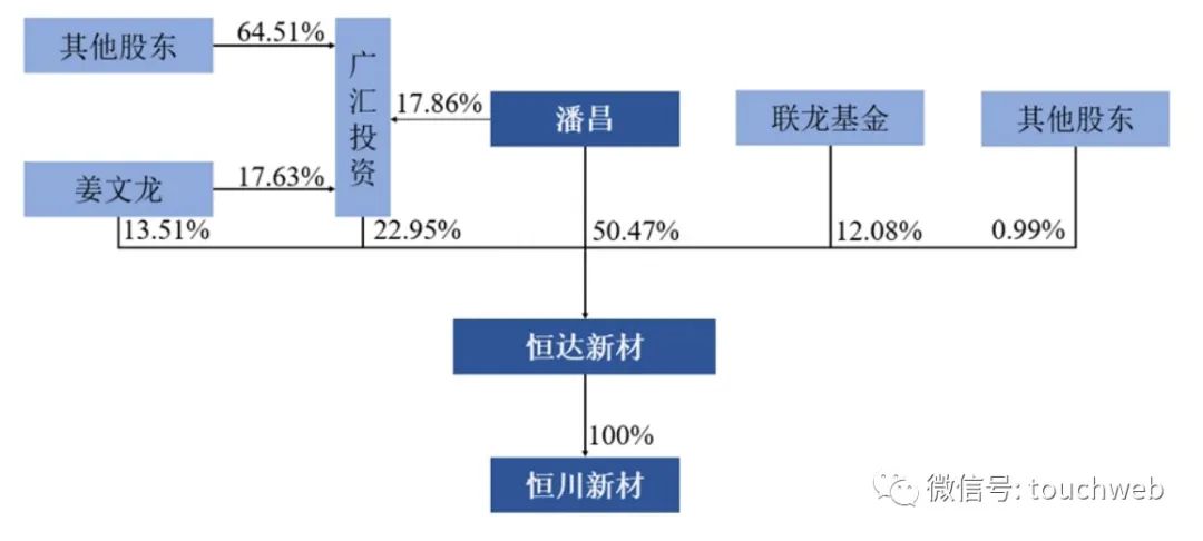 恒达新材控股股东、实际控制人为潘昌。潘昌合计持有公司54.57%的股份。其中潘昌直接持有公司3,387.3万股股份,占公司总股本的50.47%,同时通过广汇投资间接持有公司4.1%的股份。