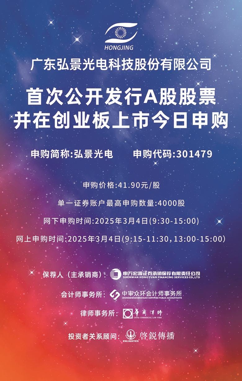 广东弘景光电科技股份有限公司首次公开发行A股股票并在创业板上市今日申购