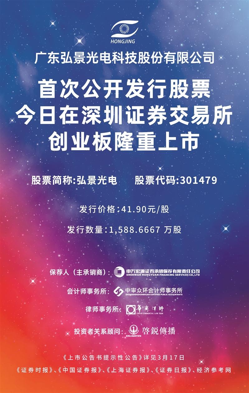 广东弘景光电科技股份有限公司首次公开发行股票今日在深圳证券交易所创业板隆重上市