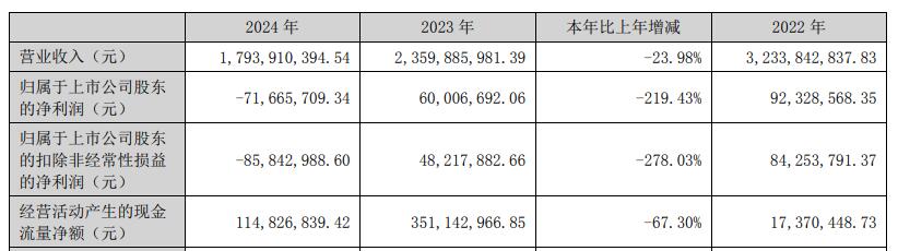 盟固利(301487.SZ) 2024年年度报告显示,2024年,公司实现营业收入17.94亿元,同比下降23.98%;归属于上市公司股东的净利润-7166.57万元,上年同期为6000.67万元;归属于上市公司股东的扣除非经常性损益的净利润-8584.30万元,上年同期为4821.79万元;经营活动产生的现金流量净额1.15亿元,同比下降67.30%。