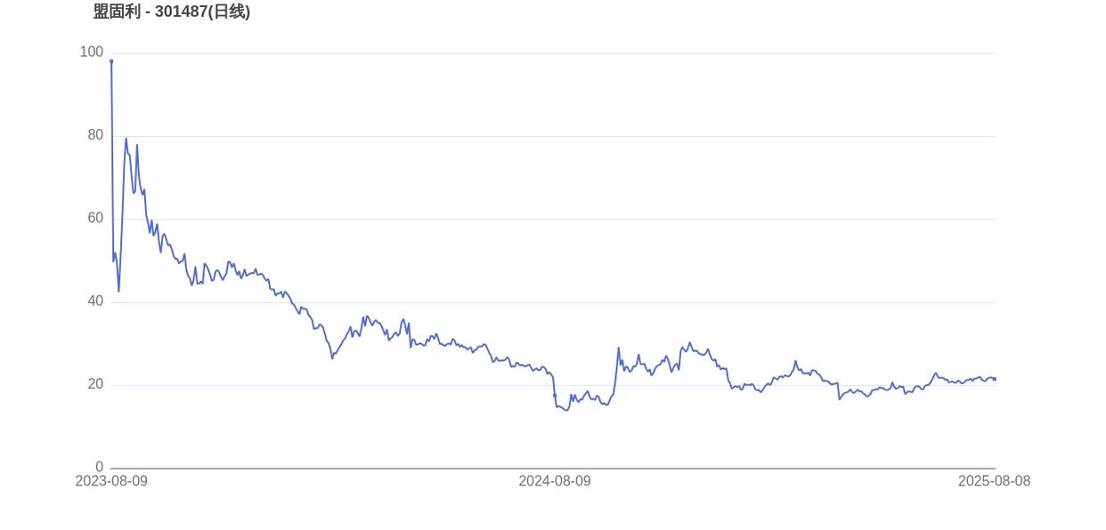 2023年08月09日,盟固利的市值巅峰达到929.11亿元,股价也顺应升至202.15元。而至2025年08月08日收盘,盟固利的股价为21.47元,市值为98.68亿元,相比峰值时期市值减少830.43亿元,市值蒸发了89.38%。