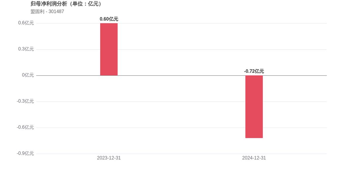 盟固利上市的2023年,当年实现归母净利润0.60亿元。截至最新完整财年的2024年,公司实现-0.72亿元的归母净利润,近年累计下降了219.43%。这2年间,盟固利有1年出现亏损。
