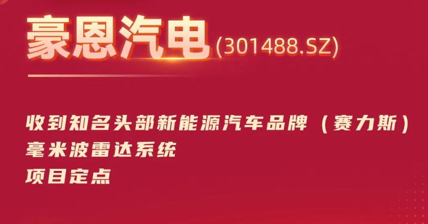 3月11日,豪恩集团宣布,汽车智能驾驶感知系统供应商豪恩汽电收到知名头部新能源汽车品牌(赛力斯)的毫米波雷达系统项目定点。