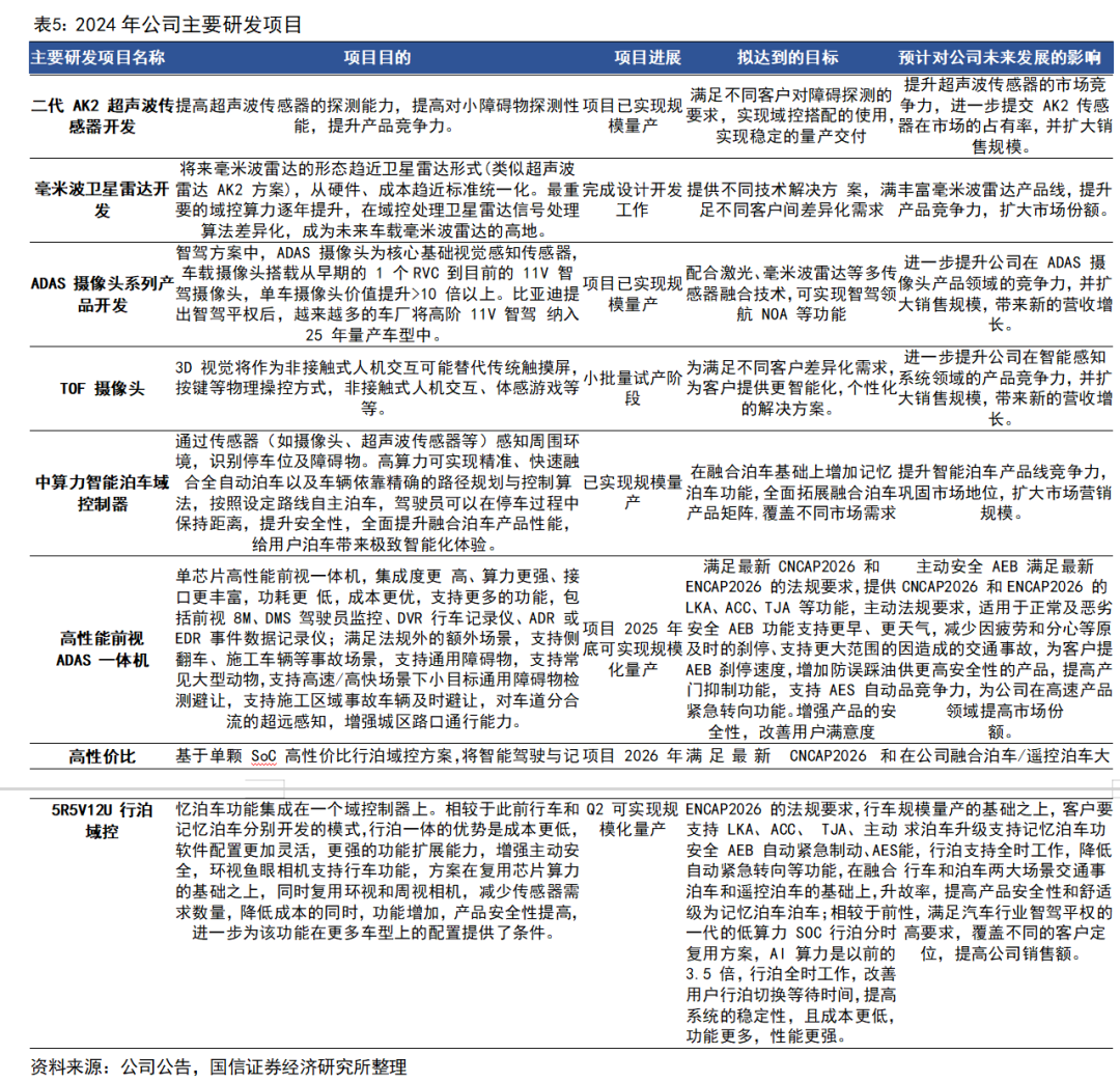 2024年,公司研发人数424人,研发人员占比38%,研发投入占营收比例为11.21%,同比+0.69pct,主要研发方向包括二代 AK2 超声波传感器开发、毫米波卫星雷达开发、ADAS 摄像头系列产品开发、TOF 摄像头、中算力智能泊车域控制器、高性能前视ADAS 一体机、高性价比5R5V12U 行泊域控等。
