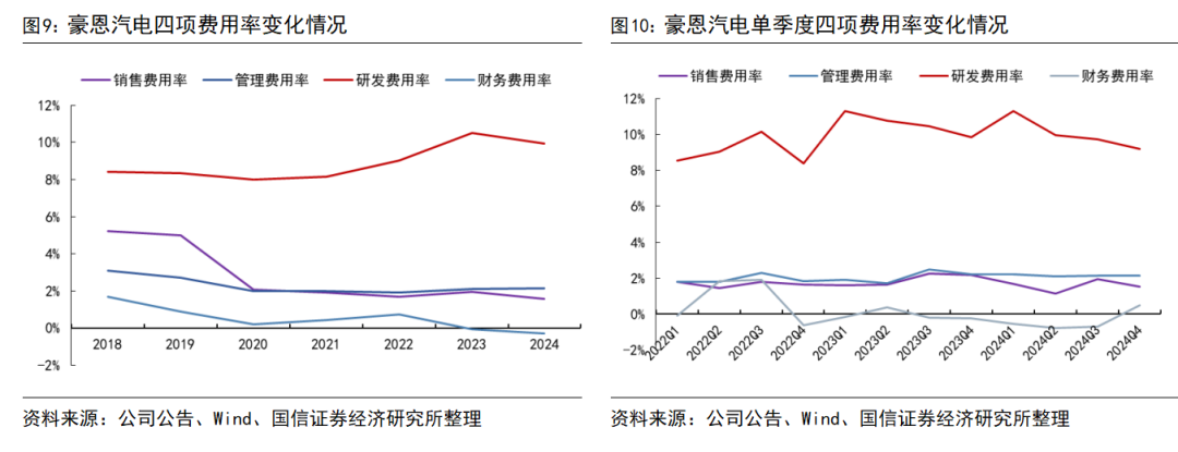 1)价升:豪恩汽电的产品从最初的摄像头、超声波雷达、车载行驶记录系统到现在的感知层(毫米波雷达、环视及泊车系统等)与决策层(驾驶域控制器)全覆盖,配套单车价值量从几百元提升至超5000元。2)量增:公司智能驾驶业务早期集中于Nippon、东风日产、上汽大众、吉利、长城汽车等合资和自主品牌燃油车客户,2023年至今,公司客户呈现新能源化(比亚迪、理想、小鹏、赛力斯、长城等)、全球化(PSA全球、德国大众、福特全球、雷诺全球等)趋势,新能源客户和全球客户的放量拉动公司智能驾驶业务增长,2024年新能源业务占比 50%左右。3)重研发:公司研发费用率超10%,研发人员数量占比超30%,重视软件和算法研发。
