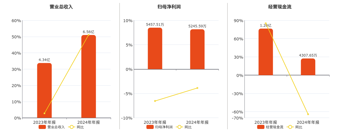 公司营业总收入为6.56亿元。归母净利润为5245.59万元,较去年同报告期归母净利润减少211.92万元,同比较去年同期下降3.88%。经营活动现金净流入为4307.65万元,较去年同报告期经营活动现金净流入减少7706.45万元,同比较去年同期下降64.15%。