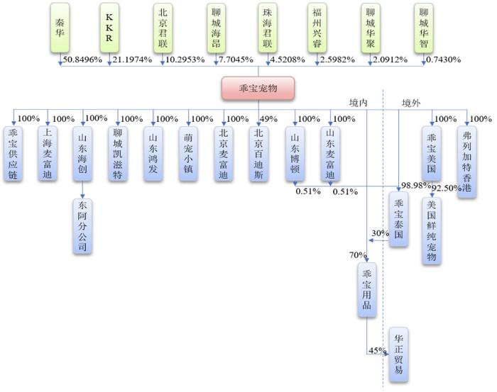 本次上市前,乖宝宠物董事长、总裁秦华直接持有该公司50.8496%的股份,并分别通过聊城华聚和聊城华智控制乖宝宠物2.0912%和0.743%股份的表决权。同时,秦华的一致行动人秦轩昂通过聊城海昂控制乖宝宠物7.7045%股份的表决权。