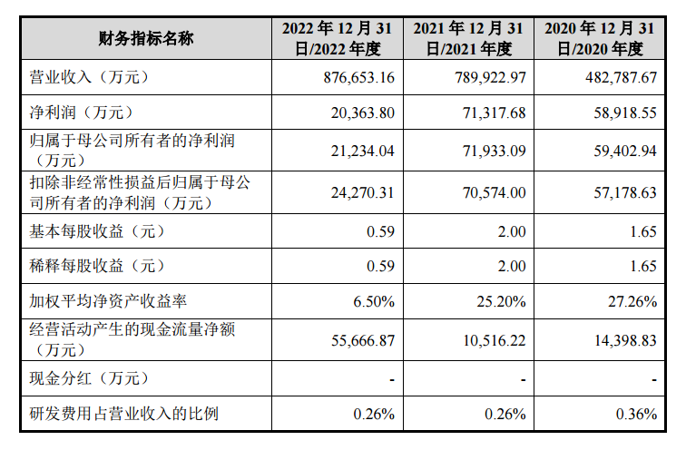 根据招股书,2020年-2022年,公司的营业收入分别为48.28亿元、78.99亿元和87.67亿元,分别同比增长12.80%、63.62%和10.98%;净利润分别为5.89亿元、7.13亿元和2.04亿元,分别较上年同期增长9.63%、21.04%和下滑71.45%。
