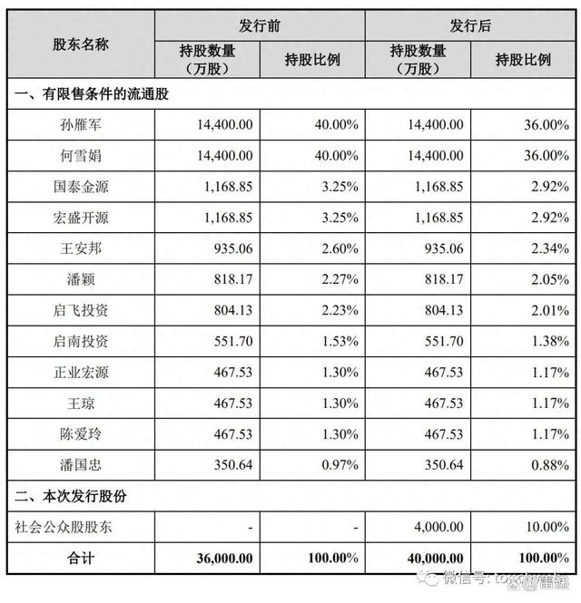 IPO后,孙雁军、何雪娟分别持股为36%,国泰金源、宏盛开源分别持股为2.92%,王安邦持股为2.34%,潘颖持股为2.05%;