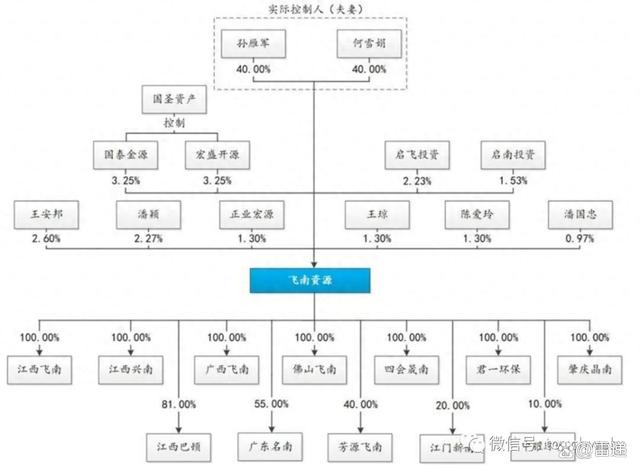 IPO前,孙雁军直接持有40%股份,何雪娟女士直接持有40%股份;孙雁军、何雪娟夫妇之子孙启航持有启飞投资55.23%的出资额并担任执行事务合伙人,可实际支配启飞投资所持有的飞南资源2.2337%的股份表决权。