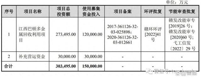 飞南资源原计划募资15亿元,其中,12亿元用于江西巴顿多金属回收利用项目,3亿元用于补充营运资金。