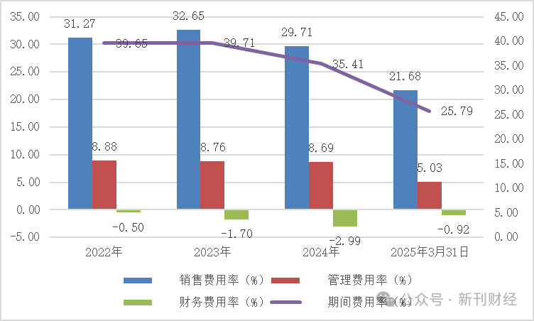 在费用结构方面,民生健康期间费用率虽呈下降趋势,但背后反映的并非成本效率的全面优化。数据显示,公司期间费用率从2022年的39.65%下降至2025年一季度的25.79%,2024年为35.41%,同比下降4.3个百分点。然而,销售费用依然高企,2024年达1.91亿元,仅小幅增长0.53%,但销售费用率依旧高达29.71%;管理费用为0.56亿元,同比增长9.8%,占比8.69%。此外,财务费用为-0.19亿元,主要依赖利息收入支撑。