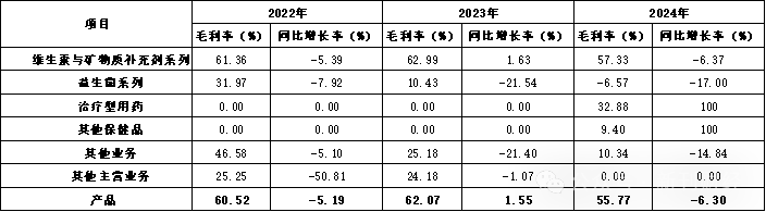 目前,公司已形成维生素与矿物质补充剂系列、益生菌系列、治疗型用药及其他保健品四大业务板块。其中,维生素与矿物质补充剂系列作为核心产品,2024年实现销售收入6.21亿元,占总营收的96.88%。相比之下,益生菌系列收入为0.04亿元,占比仅0.62%;治疗型用药为0.01亿元,占比0.16%;其他保健品及相关业务合计0.14亿元,占比2.18%。维生素与矿物质补充剂系列维持稳健增长,2024年同比上升10.47%;而益生菌板块则延续下滑趋势,同比下降33.74%,跌势仍未止住。
