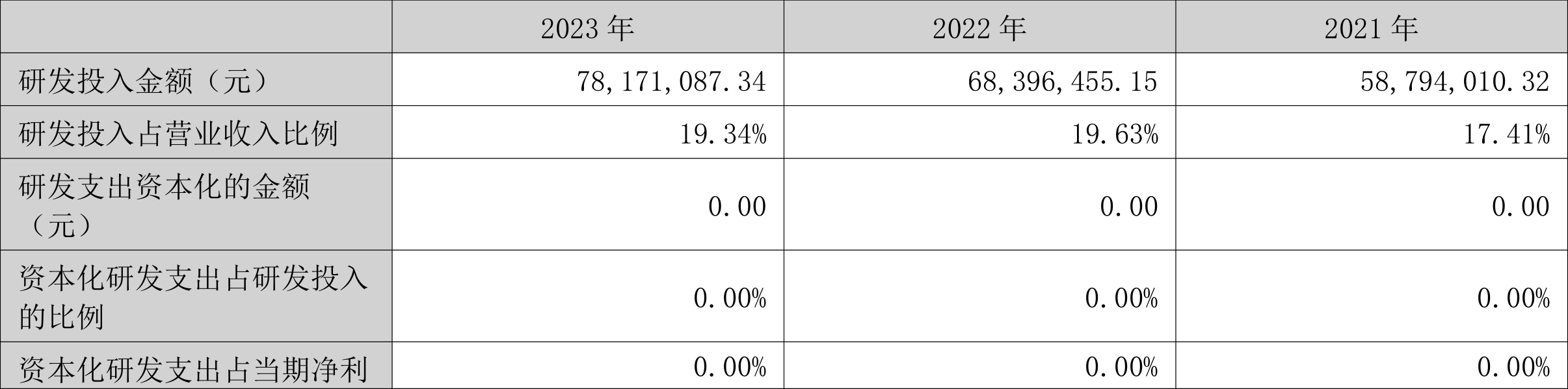 2023年全年,公司研发投入金额为7817.11万元,同比增长14.29%;研发投入占营业收入比例为19.34%,相比上年同期下降0.29个百分点。此外,公司全年研发投入资本化率为0。