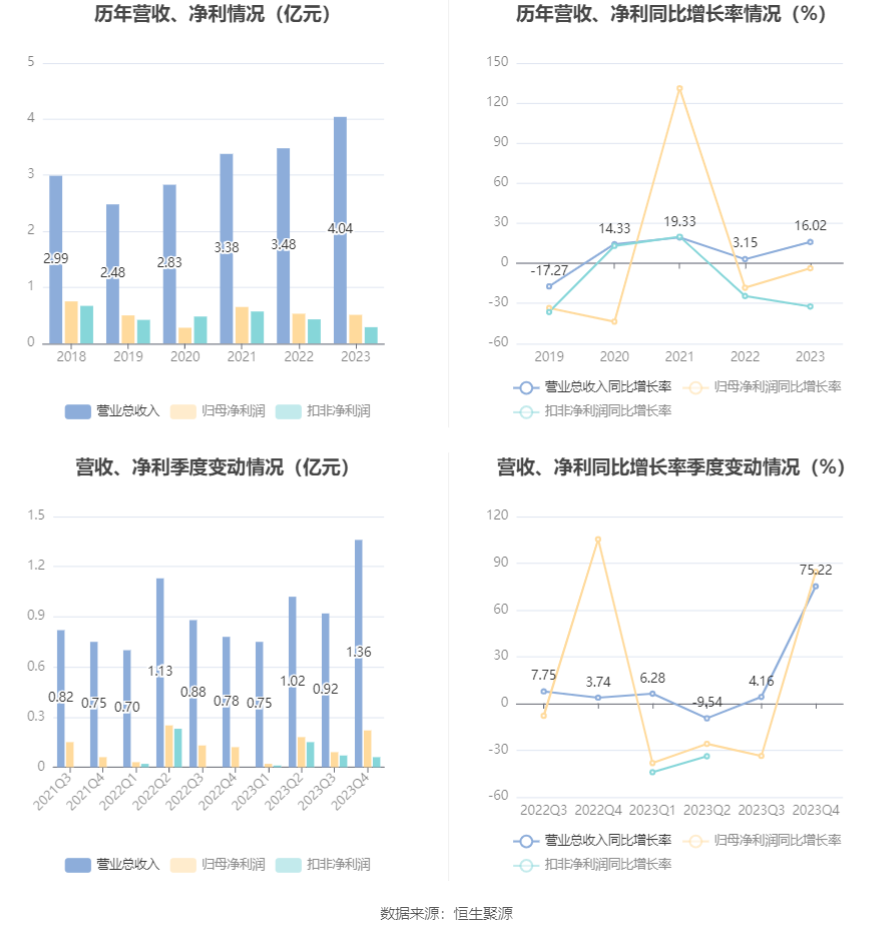 2023年,公司毛利率为46.80%,同比下降6.87个百分点;净利率为12.69%,较上年同期下降2.31个百分点。从单季度指标来看,2023年第四季度公司毛利率为41.42%,同比下降12.65个百分点,环比下降7.61个百分点;净利率为16.42%,较上年同期上升0.85个百分点,较上一季度上升6.81个百分点。