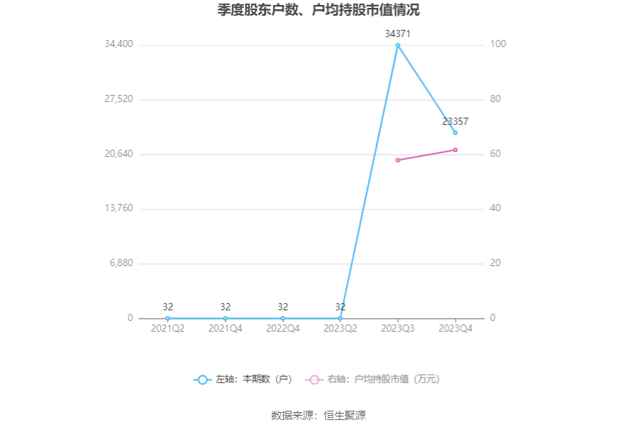 筹码集中度方面,截至2023年年末,公司股东总户数为2.34万户,较三季度末下降了1.1万户,降幅32.04%;户均持股市值由三季度末的57.90万元上升至61.64万元,增幅为6.46%。