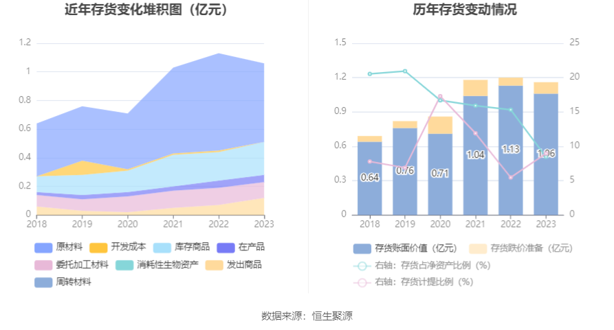 从存货变动来看,截至2023年年末,公司存货账面价值为1.06亿元,占净资产的8.47%,较上年末减少648.11万元。其中,存货跌价准备为1042.32万元,计提比例为8.95%。