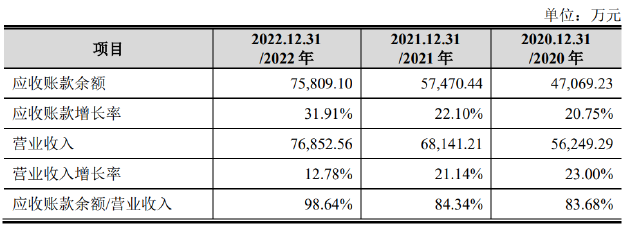 招股书显示,2020年-2022年,公司应收账款余额连年保持20%以上的增长,由2020年的4.71亿元迅速上升至2022年的7.58亿元。