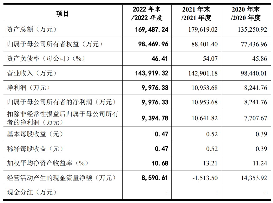 财务方面,于2020年度、2021年度及2022年度,公司实现营业收入分别约为9.84亿元、14.29亿元、14.39亿元。公司净利润分别约为8241.76万元、1.10亿元、9976.33万元人民币。