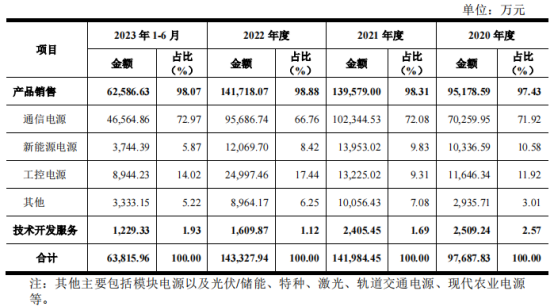 中远通是一家专注于通信电源、新能源电源和工控电源等产品的研发、生产和销售的科技创新驱动型企业,为通信、新能源汽车和工业自动化控制等领域客户提供定制电源解决方案,其主要产品包含通信电源、新能源电源、工控电源三大板块,具体营收占比如下: