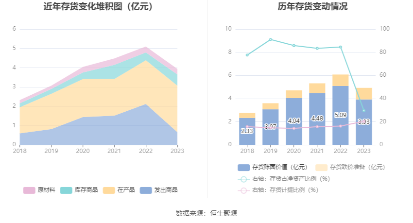 从存货变动来看,截至2023年年末,公司存货账面价值为3.93亿元,占净资产的29.61%,较上年末减少1.16亿元。其中,存货跌价准备为1.0亿元,计提比例为20.36%。