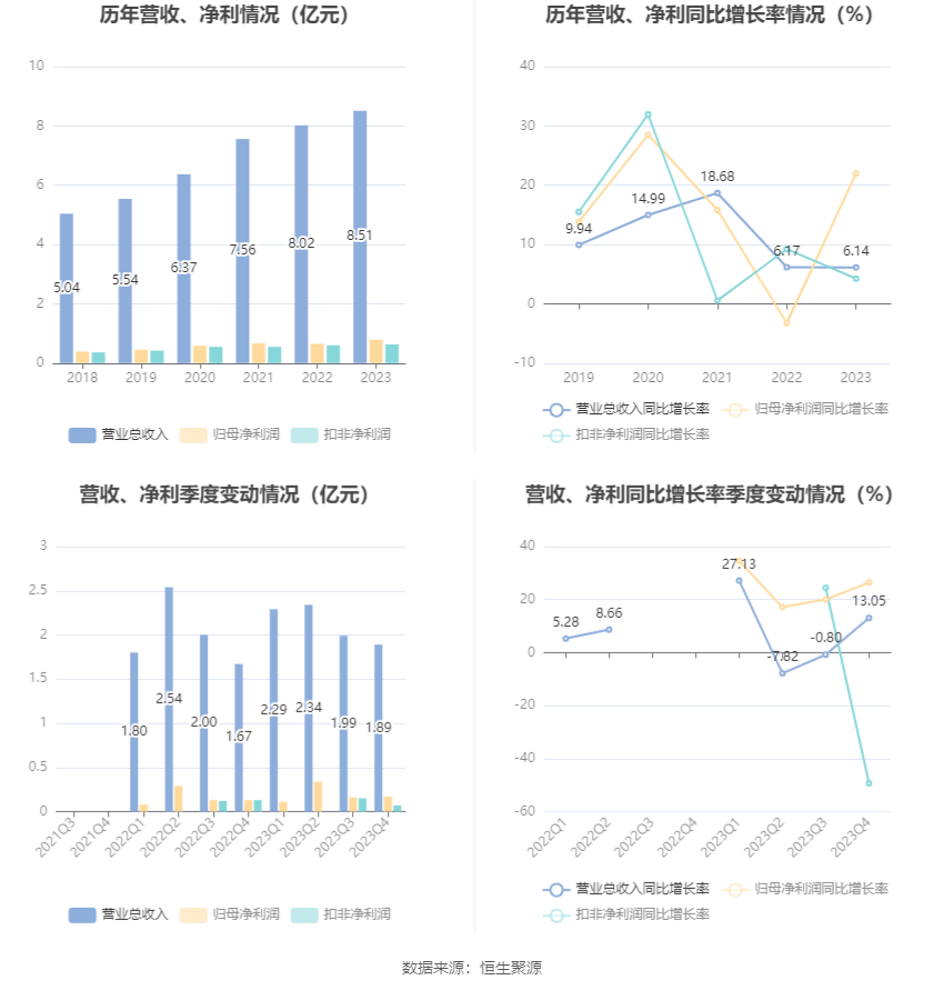 2023年,公司毛利率为40.17%,同比下降1.19个百分点;净利率为9.59%,较上年同期下降0.27个百分点。从单季度指标来看,2023年第四季度公司毛利率为34.25%,同比下降7.09个百分点,环比下降10.31个百分点;净利率为8.81%,较上年同期下降1.39个百分点,较上一季度上升0.89个百分点。