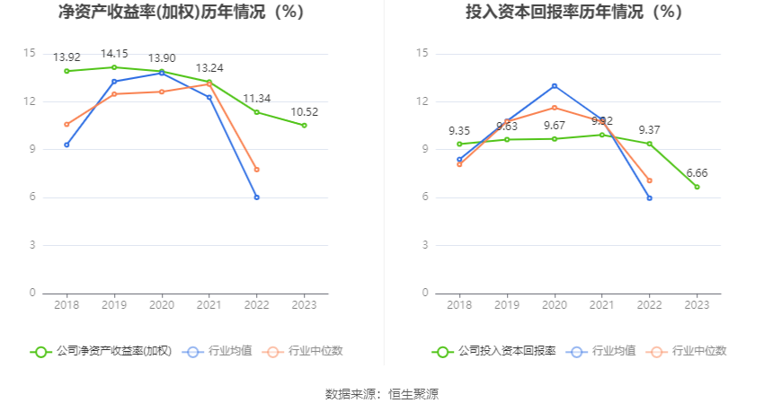 数据显示,2023年公司加权平均净资产收益率为10.52%,较上年同期下降0.82个百分点;公司2023年投入资本回报率为6.66%,较上年同期下降2.71个百分点。