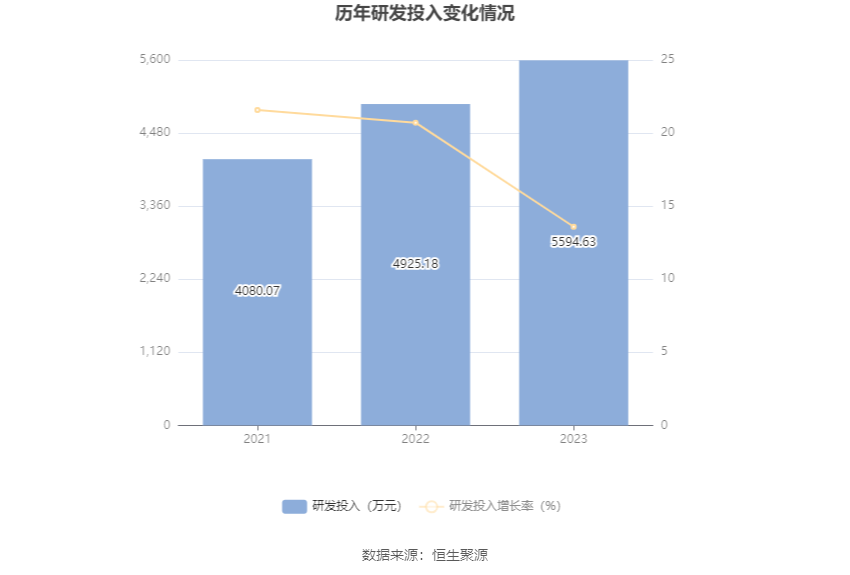 2023年全年,公司研发投入金额为5594.63万元,同比增长13.59%;研发投入占营业收入比例为6.57%,相比上年同期上升0.43个百分点。此外,公司全年研发投入资本化率为0。