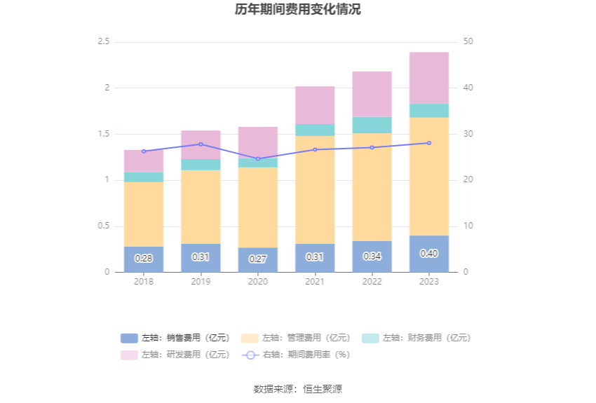 2023年,公司期间费用为2.39亿元,较上年同期增加2160.95万元;期间费用率为28.09%,较上年同期上升0.97个百分点。其中,销售费用同比增长16.19%,管理费用同比增长9.9%,研发费用同比增长13.59%,财务费用同比下降12.42%。
