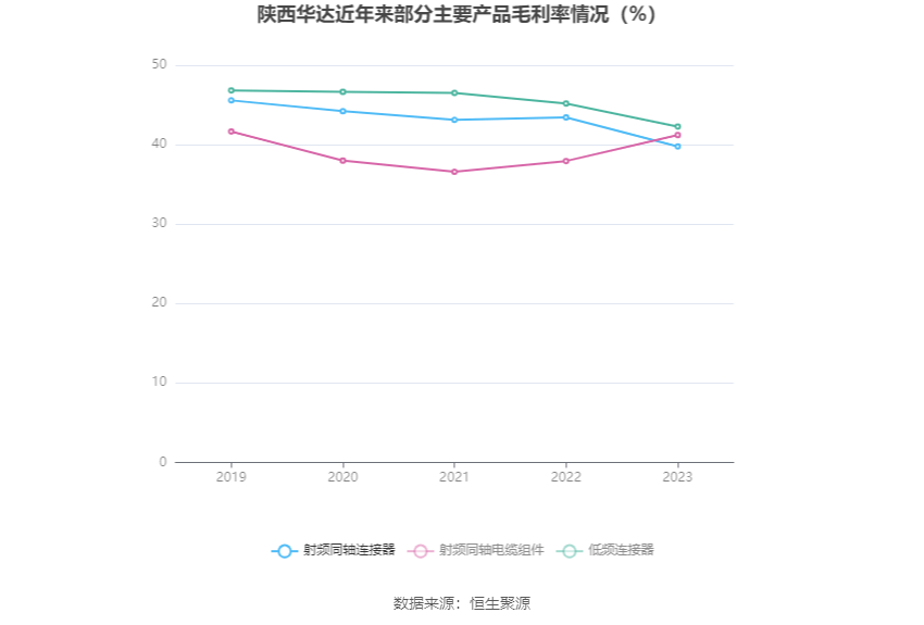 分产品看,射频同轴连接器、射频同轴电缆组件、低频连接器2023年毛利率分别为39.78%、41.21%、42.28%。