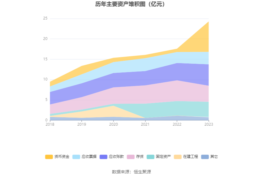资产重大变化方面,截至2023年年末,公司货币资金较上年末增加827.91%,占公司总资产比重上升26.28个百分点;存货较上年末减少22.77%,占公司总资产比重下降12.77个百分点;固定资产较上年末增加4.99%,占公司总资产比重下降4.87个百分点;应收票据较上年末增加12.41%,占公司总资产比重下降2.88个百分点。